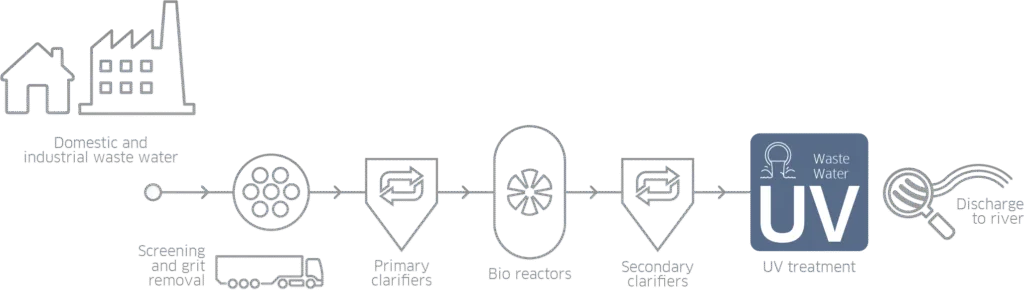 Wraz ze wzrostem poziomu urbanizacji, a także coraz częściej pojawiającym się stresem wodnym rośnie potrzeba trzeciorzędowego oczyszczania i dezynfekcji ścieków, szczególnie w przypadku odprowadzania wody do wrażliwych środowisk. Technologia UV oraz urządzenia jakie oferujemy, jest w takiej sytuacji preferowaną alternatywą dla tradycyjnej metody chlorowania w procesie wieloetapowego oczyszczania i dezynfekcji ścieków.