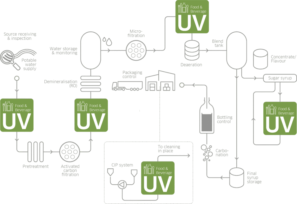 Mikroorganizmy przenoszone przez wodę mogą poważnie zagrozić zdrowiu konsumentów, a także negatywnie wpłynąć na smak, kolor, zapach i okres przydatności produktu. Głównym celem producentów żywności i napojów jest usuwanie mikroorganizmów z wody procesowej, wody produktowej, wody składnikowej, CIP, syropu cukrowego i dezynfekcji solanki.